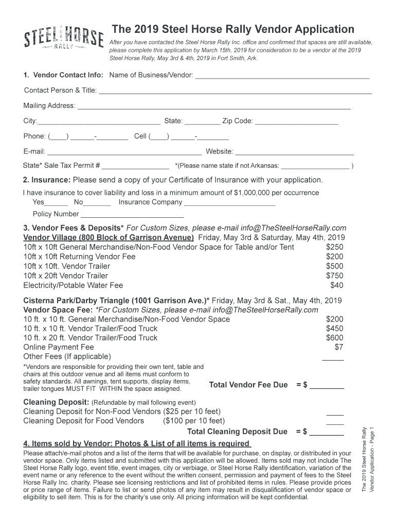 The 2019 Steel Horse Rally Vendor Application After you have contacted the Steel Horse Rally Inc. office and confirmed that spaces are still available, please complete this application by March 15th,
