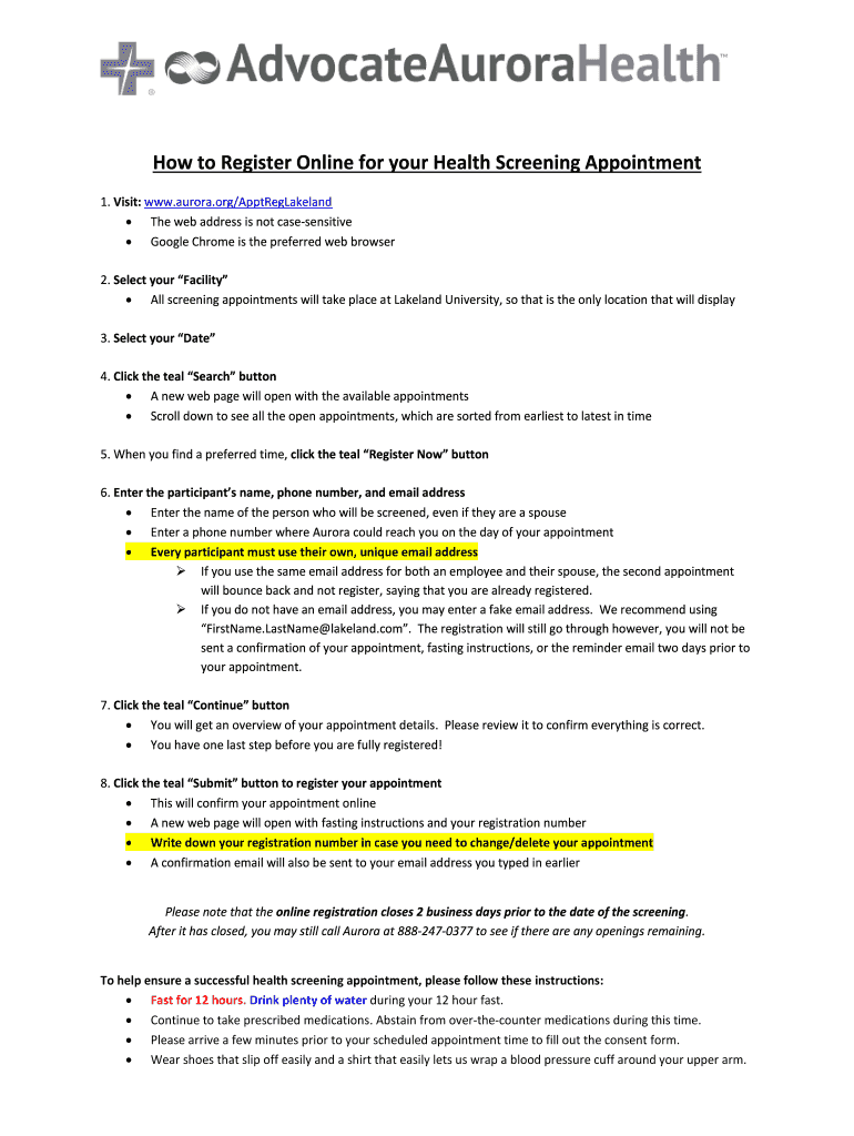 How to Register Online for your Health Screening Appointment 1. Visit: www.aurora.org/ApptRegLakeland The web address is not case-sensitive Google Chrome is the preferred web browser 2. Select your