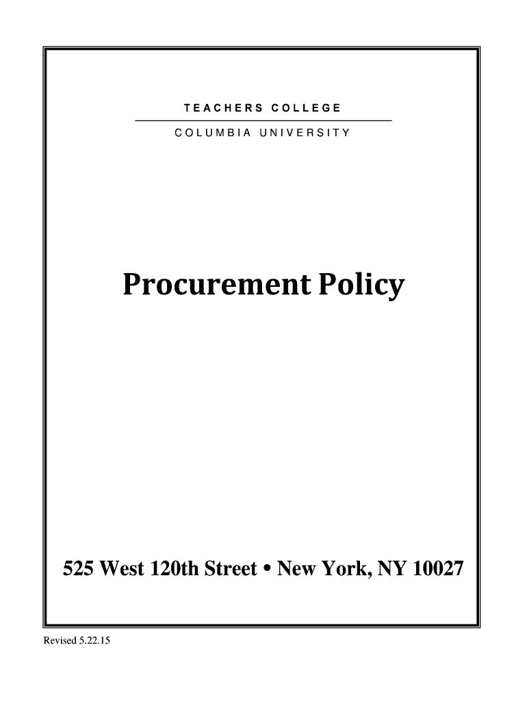 TEACHERS COLLEGE COLUMBIA UNIVERSITYProcurement Policy525 West 120th Street New York, NY 10027Revised 5.22.15Table of ContentsProcurement Policy Overview...................................................................................................