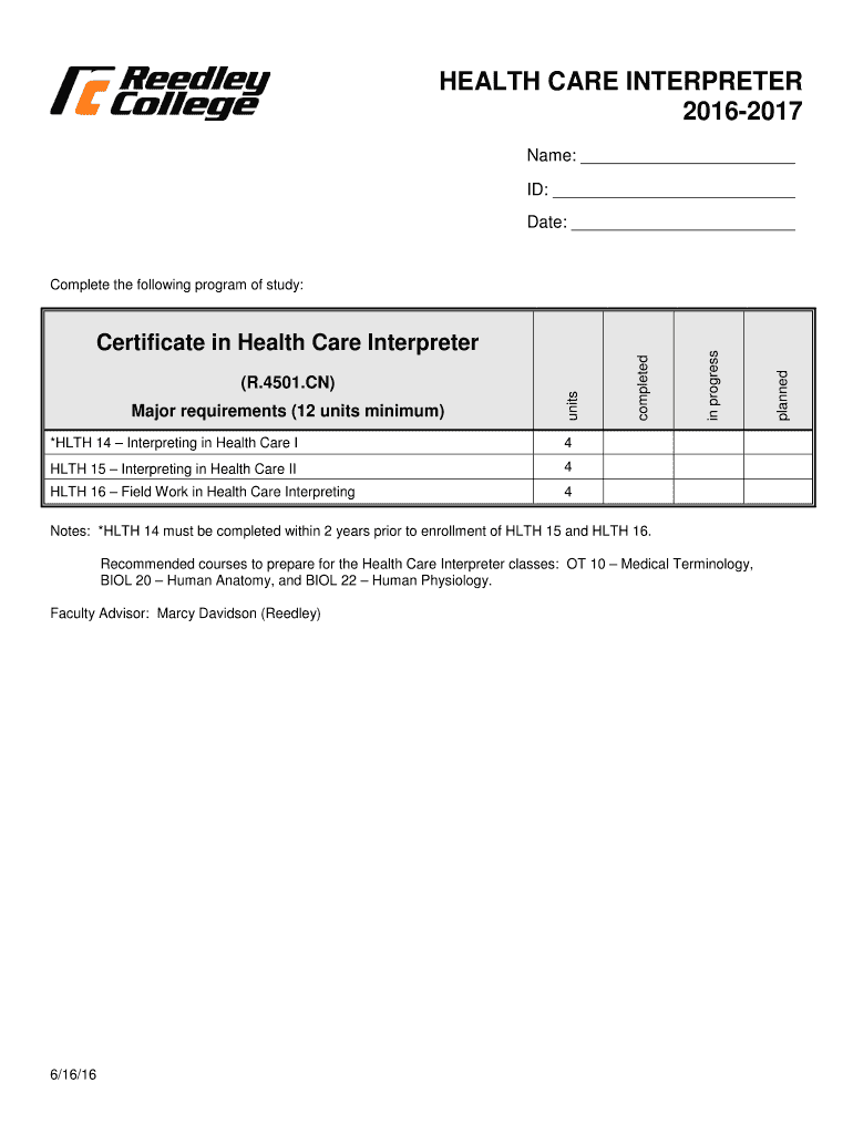 HEALTH CARE INTERPRETER 20162017 Name: ID: Date: *HATH 14 Interpreting in Health Care I4HLTH 15 Interpreting in Health Care II4HLTH 16 Field Work in Health Care Interpreting4Notes: *HATH 14 must be