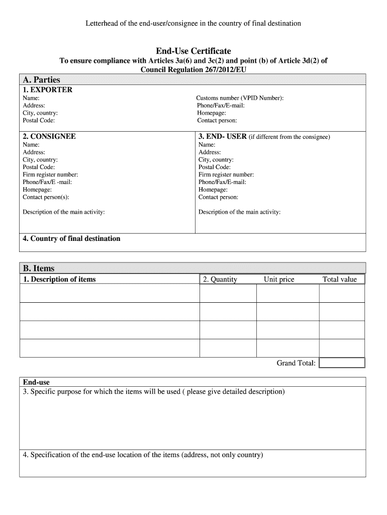 Letterhead of the end user/consignee in the country of final destinationEndUse Certificate