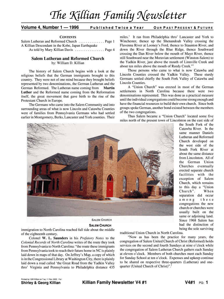 The Killian Family Newsletter Volume 4, Number 1 1996Published Twice a Malcontents Salem Lutheran and Reformed Church. . . . . . . . . . . . . . Page 1 A Killian Descendant in the Kobe, Japan Earthquake