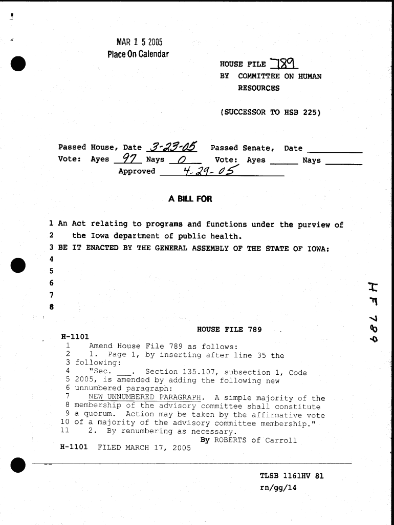 MAR 1 5 ZOOS Place On Calendar:rehouse FILE BY COMMITTEE ON HUMAN RESOURCES (SUCCESSOR TO HUB 225)Passed House, Date J? 'Ply? 'd Passed Senate, Vote: Ayes 97 Nays 0 Vote: Ayes TF. 21 Cl Approved5Date