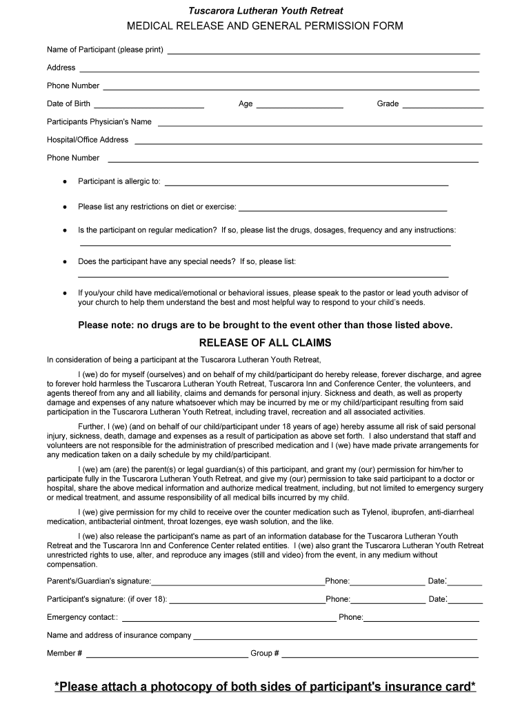 Tuscarora Lutheran Youth RetreatMEDICAL RELEASE AND GENERAL PERMISSION FORM Name of Participant (please print) Address Phone Number Date of Birth Age Grade Participants Physician's Name Hospital/Office