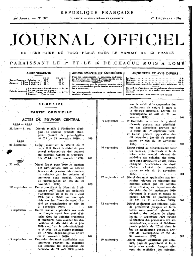 REP Belau E 20 ANNE. L!BERT N 387FRANAISEGALl 'l FRA,TBRNITE1 DCEMBRE1939JOURNAL OFFICIELDUTERRITOIRETOGO PLACDUPARAISSANT Lentils, ....... ET Colonies, 'Etna.er.AS 'for, t PP, demand 50 &. P:: 'Y