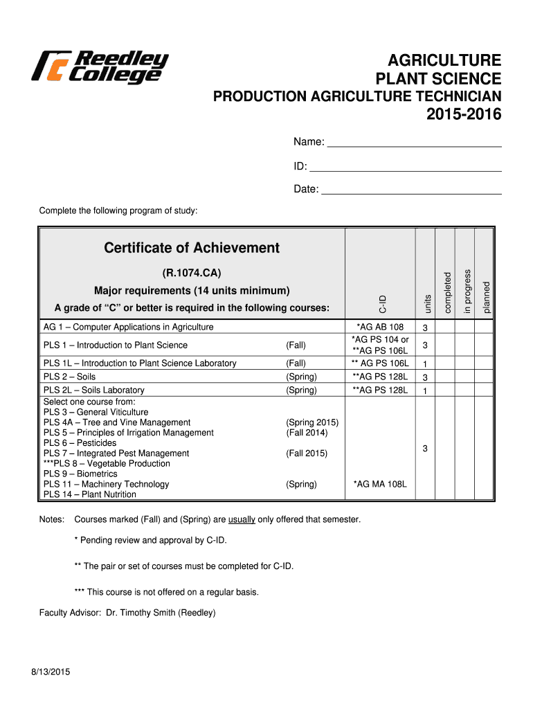 AGRICULTURE PLANT SCIENCE PRODUCTION AGRICULTURE TECHNICIAN20152016 Name: ID: Date: Complete the following program of study:AG 1 Computer Applications in Agriculture PLS 1 Introduction to Plant Science(Fall)PLS