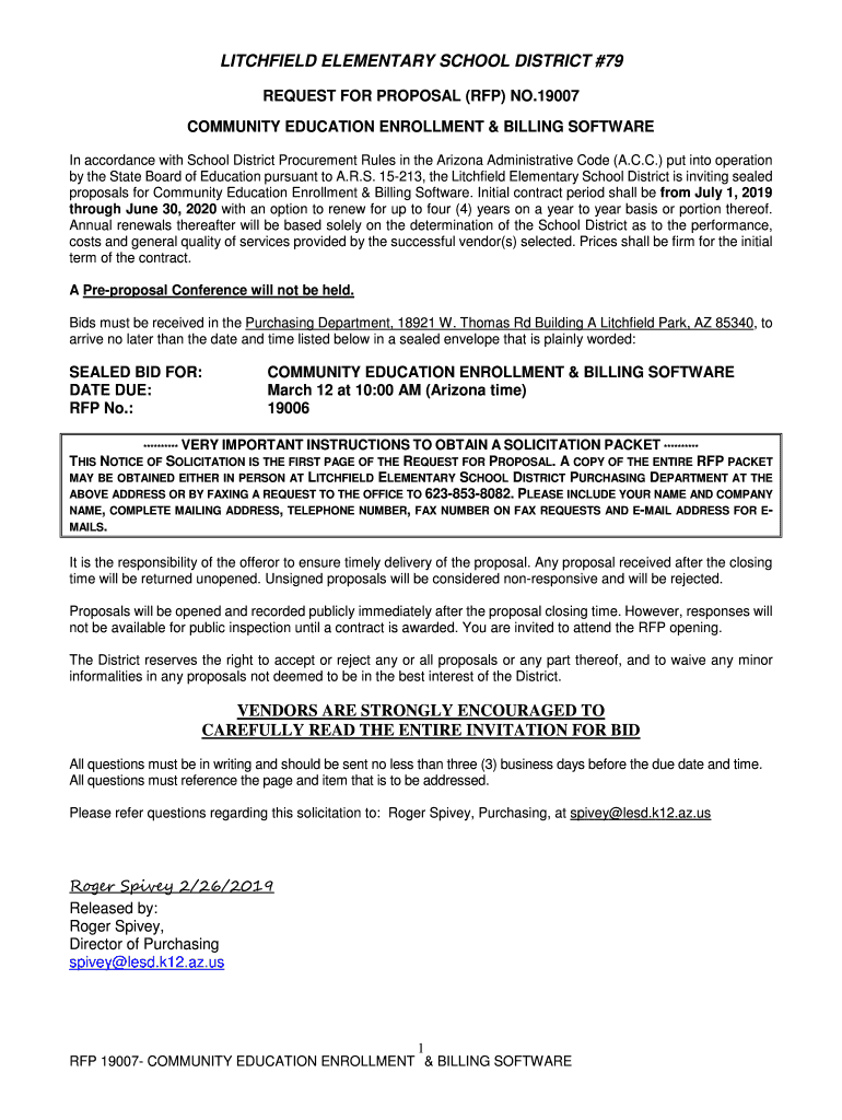 LITCHFIELD ELEMENTARY SCHOOL DISTRICT #79 REQUEST FOR PROPOSAL (RFP) NO.19007 COMMUNITY EDUCATION ENROLLMENT & BILLING SOFTWARE In accordance with School District Procurement Rules in the Arizona