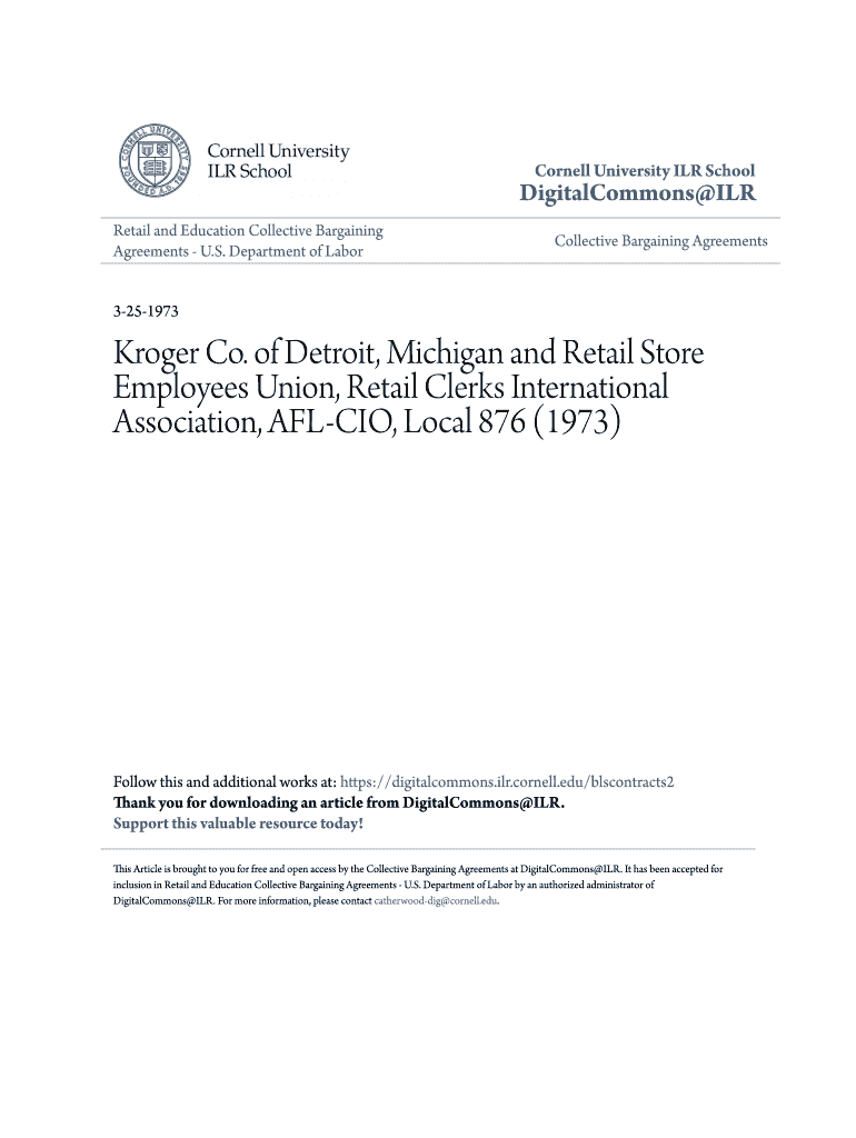Cornell University ILL SchoolDigitalCommons ILL Retail and Education Collective Bargaining Agreements U.S. Department of LaborCollective Bargaining Agreements3251973Kroger Co. of Detroit, Michigan