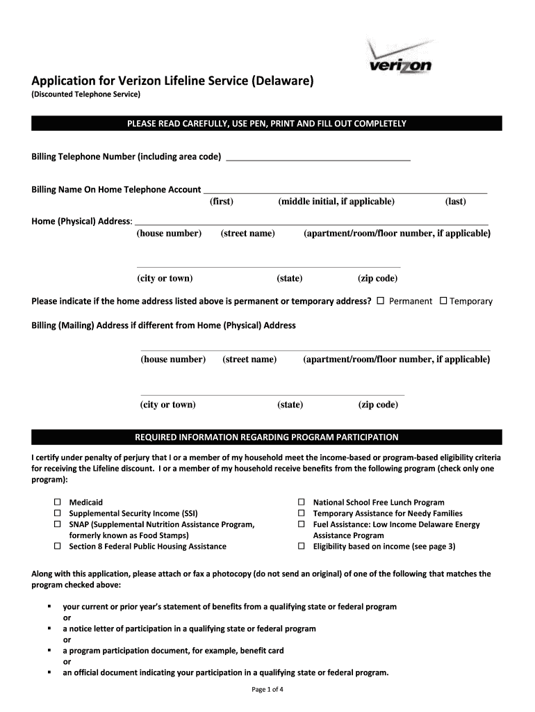Application for Verizon Lifeline Service (Delaware) (Discounted Telephone Service)PLEASE READ CAREFULLY, USE PEN, PRINT AND FILL OUT COMPLETELY Billing Telephone Number (including area code) Billing