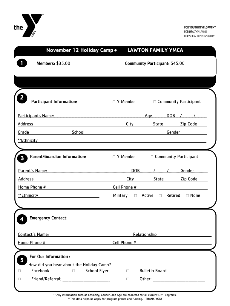 November 12 Holiday Camp 1Members: $35.002LAWTON FAMILY YMCA Community Participant: $45.00 Y MemberParticipant Information: Community ParticipantParticipants Name:AgeAddressCityGradeStateSchool**Ethnicity3/Zip