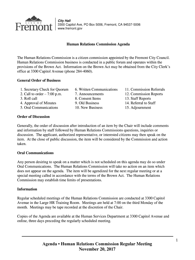 www.fremont.govHuman Relations Commission Agenda Human Relations Commission is a citizen commission appointed by the Fremont City