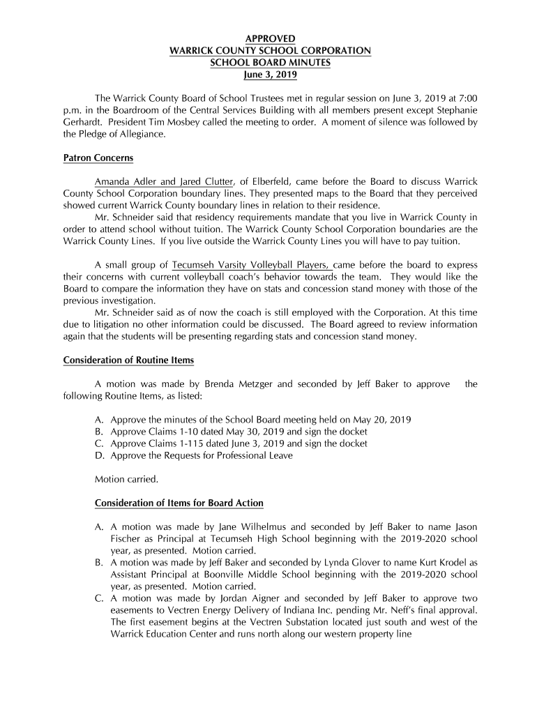 The Warrick County Board of School Trustees met in regular session on June 3, 2019, at 7:00