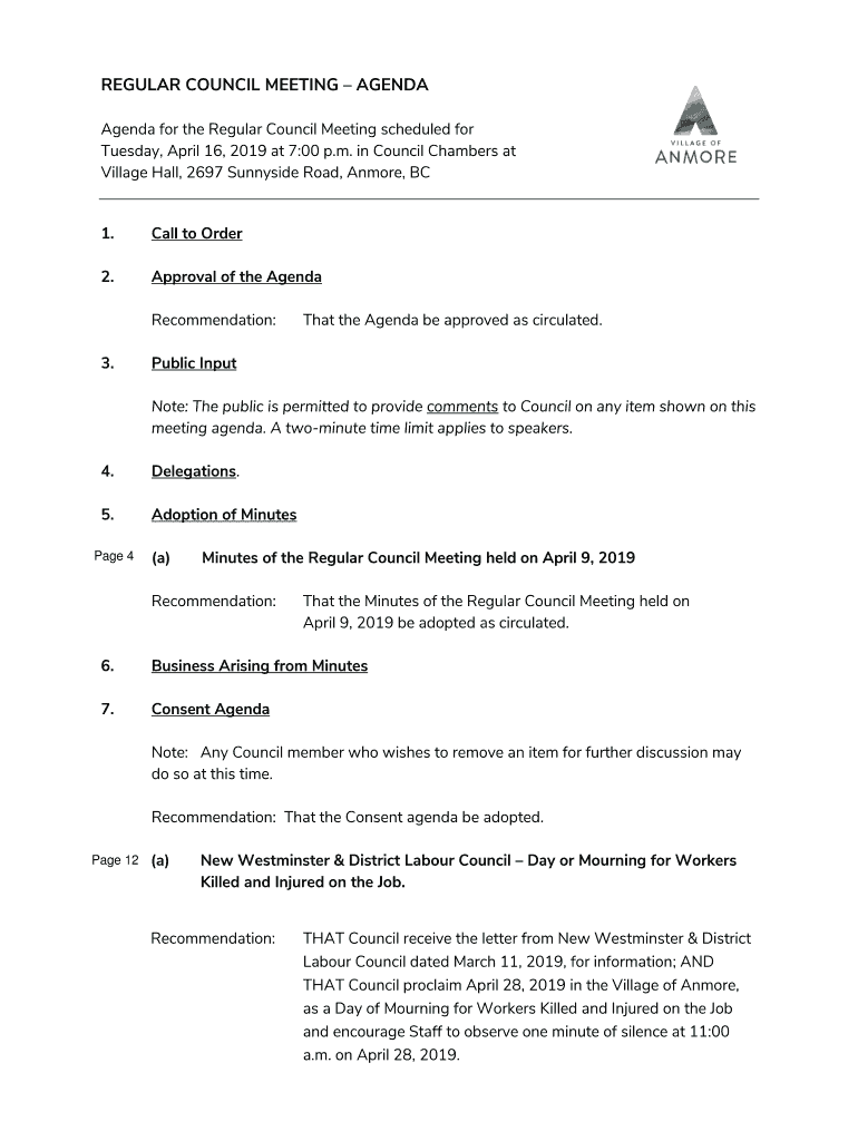 REGULAR COUNCIL MEETING AGENDA for the Regular Council Meeting scheduled for Tuesday, April 16, 2019, at 7:00 p.m. in Council Chambers at Village Hall, 2697 Sunnyside Road, Anymore, BC 1. Call to