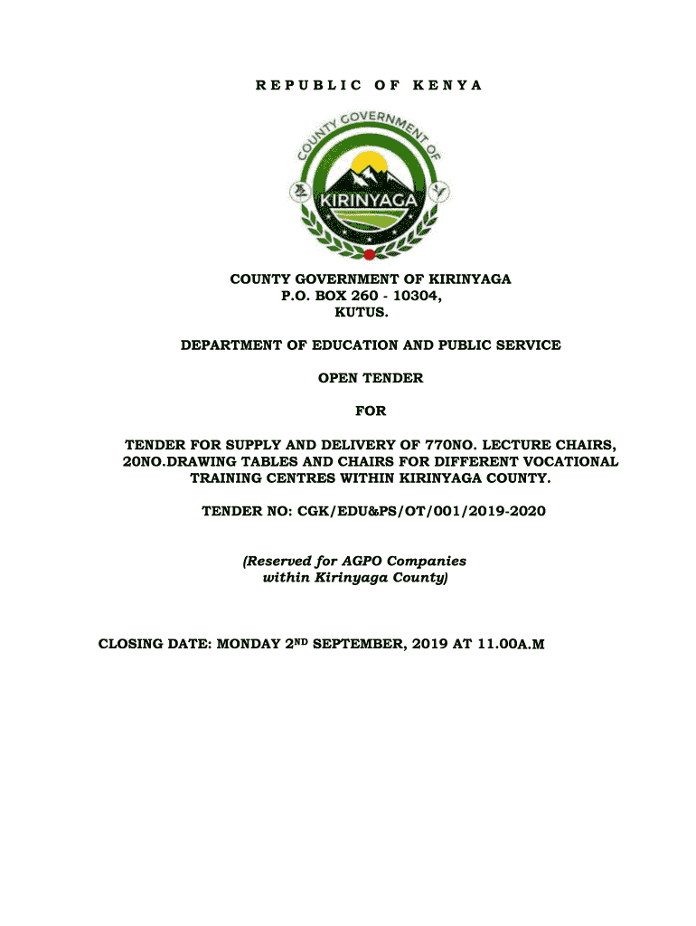 REPUBLIC OF KENYACOUNTY GOVERNMENT OF KIRINYAGA P.O. BOX 260 10304, TUTUS. DEPARTMENT OF EDUCATION AND PUBLIC SERVICE OPEN TENDER FOR SUPPLY AND DELIVERY OF 770NO. LECTURE CHAIRS, 20NO.DRAWING TABLES