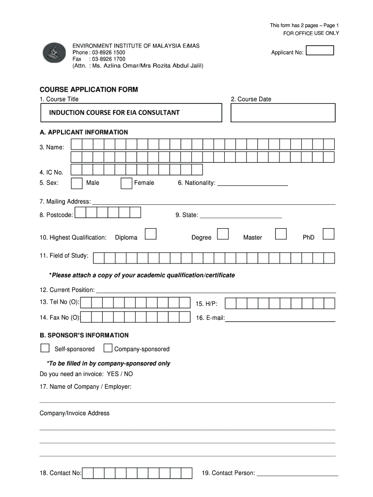 This form has 2 pages Page 1 FOR OFFICE USE ONLYENVIRONMENT INSTITUTE OF MALAYSIA Times Phone : 038926 1500 Fax : 038926 1700 (Attn. Ms. Alina Omar/Mrs Rita Abdul Jail)Applicant No:COURSE APPLICATION
