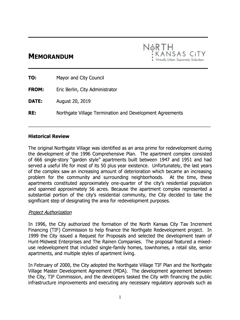 MEMORANDUM TO:Mayor and City Councilor:Eric Berlin, City AdministratorDATE:August 20, 2019RE:North gate Village Termination and Development Agreements Historical Review The original North gate Village