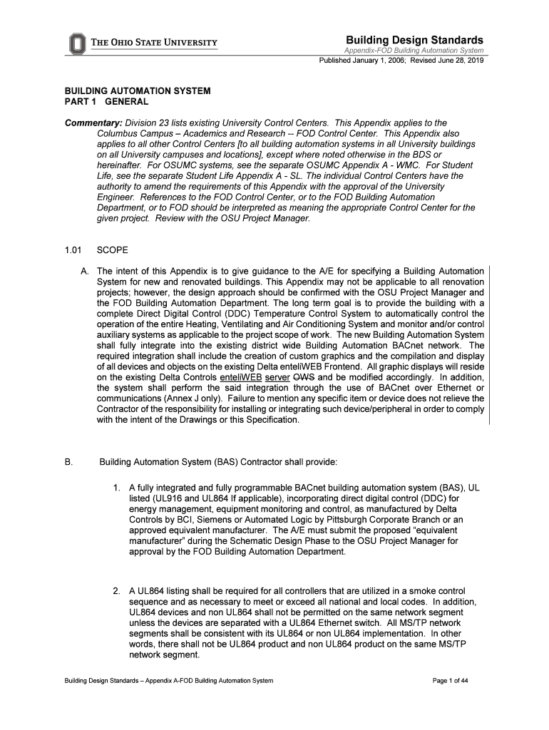 Building Design StandardsAppendixFOD Building Automation System Published January 1, 2006; Revised June 28, 2019BUILDING AUTOMATION SYSTEM PART 1 GENERAL Commentary: Division 23 lists existing University
