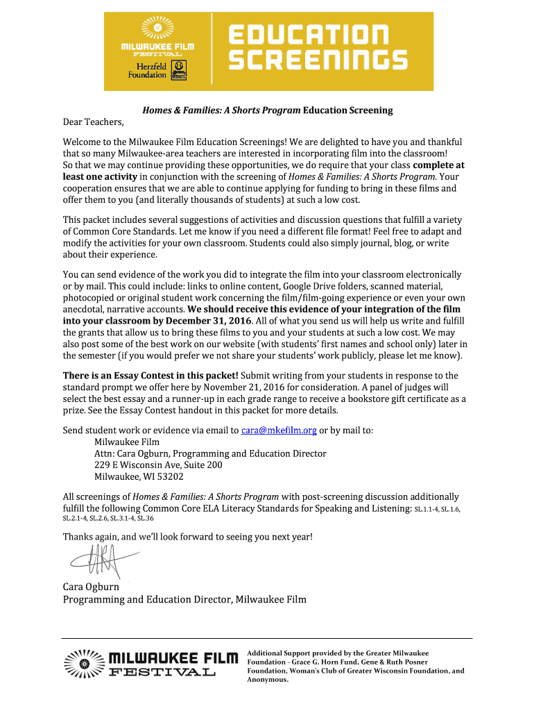 Homes & Families: A Shorts Program Education Screening Dear Teachers, Welcome to the Milwaukee Film Education Screenings! We are delighted to have you and thankful that so many Milwaukee area teachers