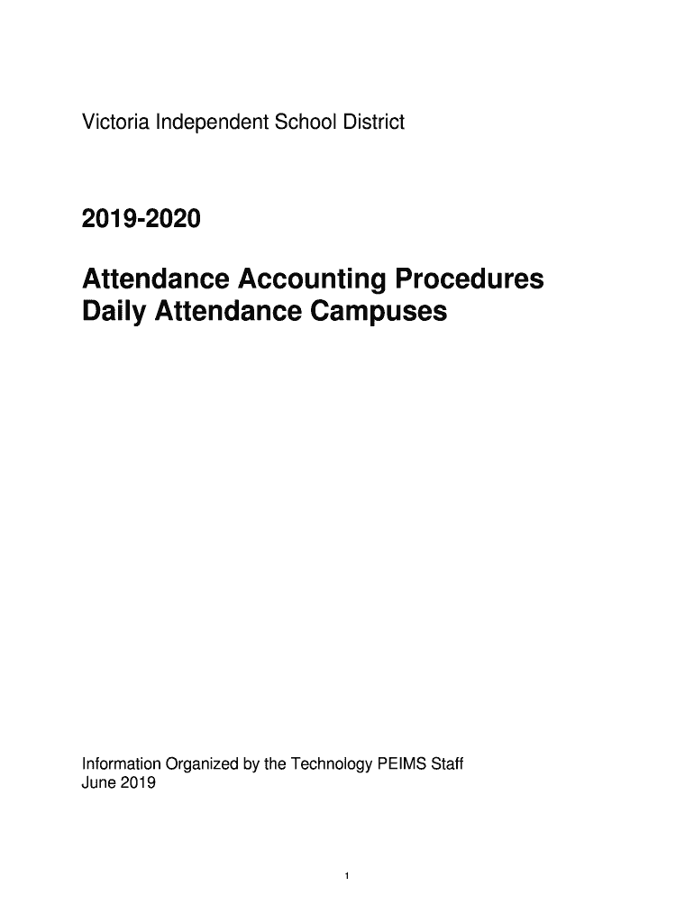 Victoria Independent School District20192020Attendance Accounting Procedures Daily Attendance CampusesInformation Organized by the Technology PERMS Staff June 201912Table of Contents 2019 2020 Calendars