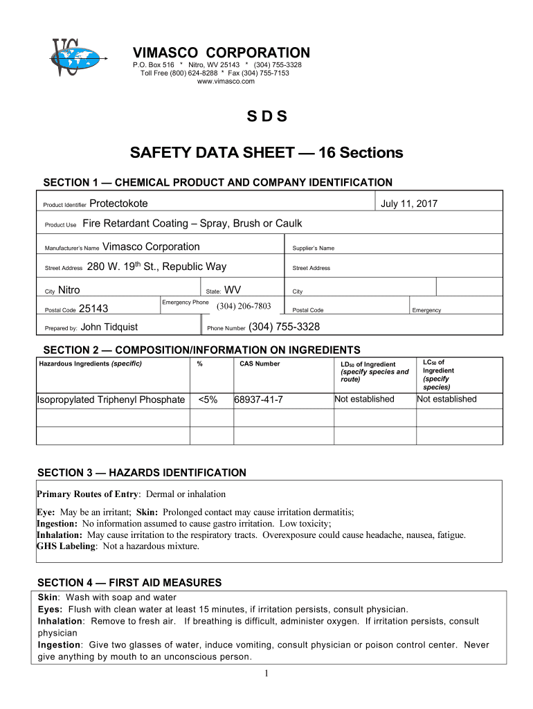 FIASCO CORPORATION P.O. Box 516 * Nitro, WV 25143 * (304) 7553328 Toll Free (800) 6248288 * Fax (304) 7557153 www.vimasco.comSDS SAFETY DATA SHEET 16 Sections SECTION 1 CHEMICAL PRODUCT AND COMPANY