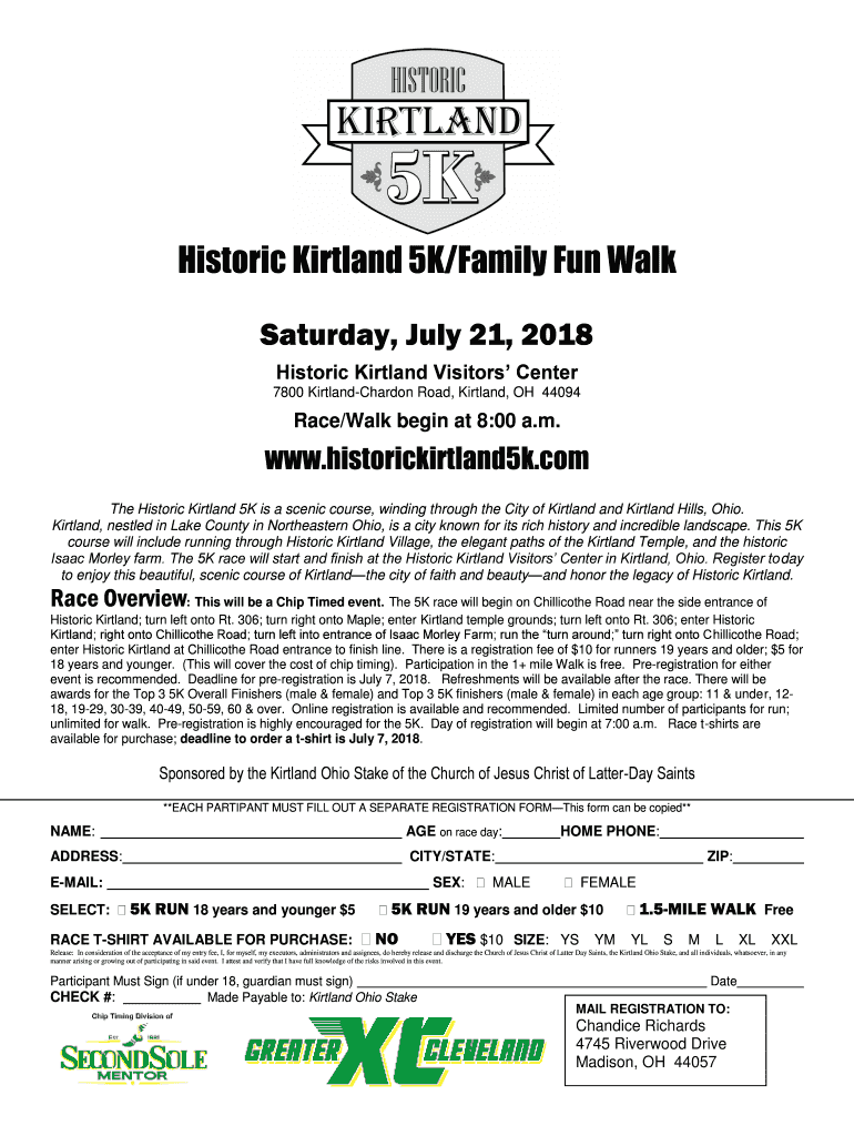 7800 KirtlandChardon Road, Kirtland, OH 44094Race/Walk begin at 8:00 a.m.www.historickirtland5k.com