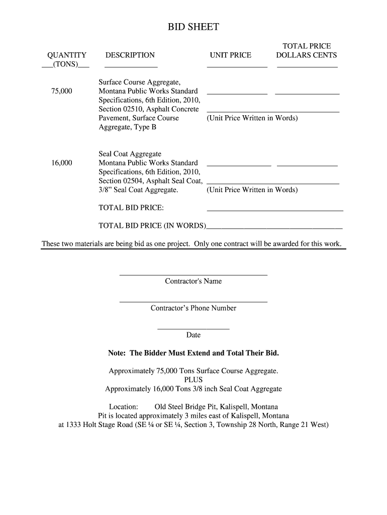 BID SHEET QUANTITY (TONS) 75,00016,000DESCRIPTION UNIT PRICE TOTAL PRICE DOLLARS CENTS Surface Course Aggregate, Montana Public Works Standard Specifications, 6th Edition, 2010, Section 02510, Asphalt