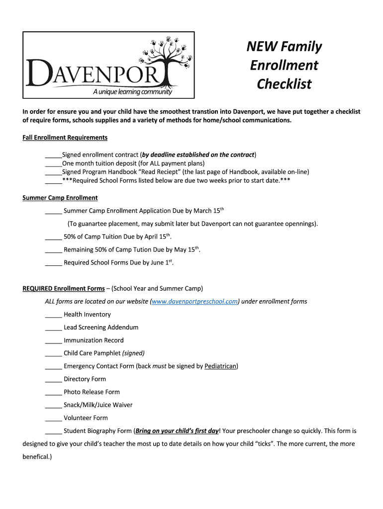 NEW Family Enrollment Checklist In order for ensure you and your child have the smoothest transition into Davenport, we have put together a checklist of require forms, schools supplies and a variety