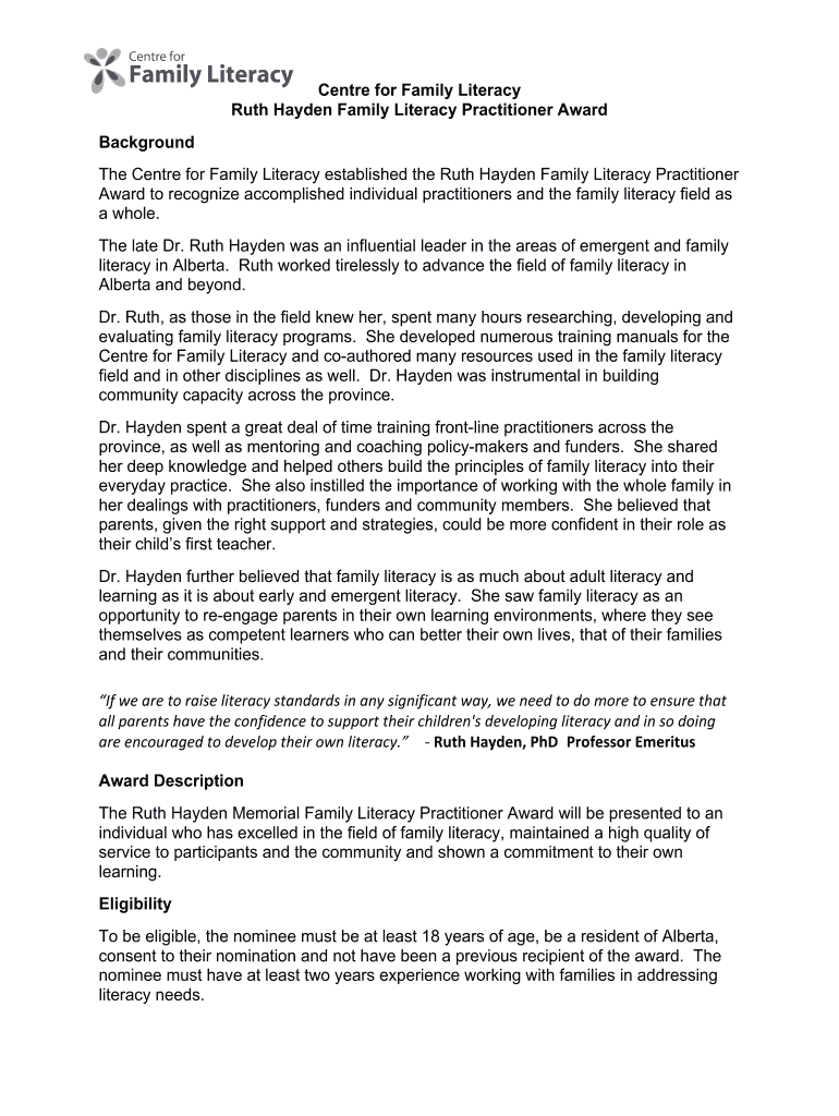 The Center for Family Literacy established the Ruth Hayden Family Literacy Practitioner
