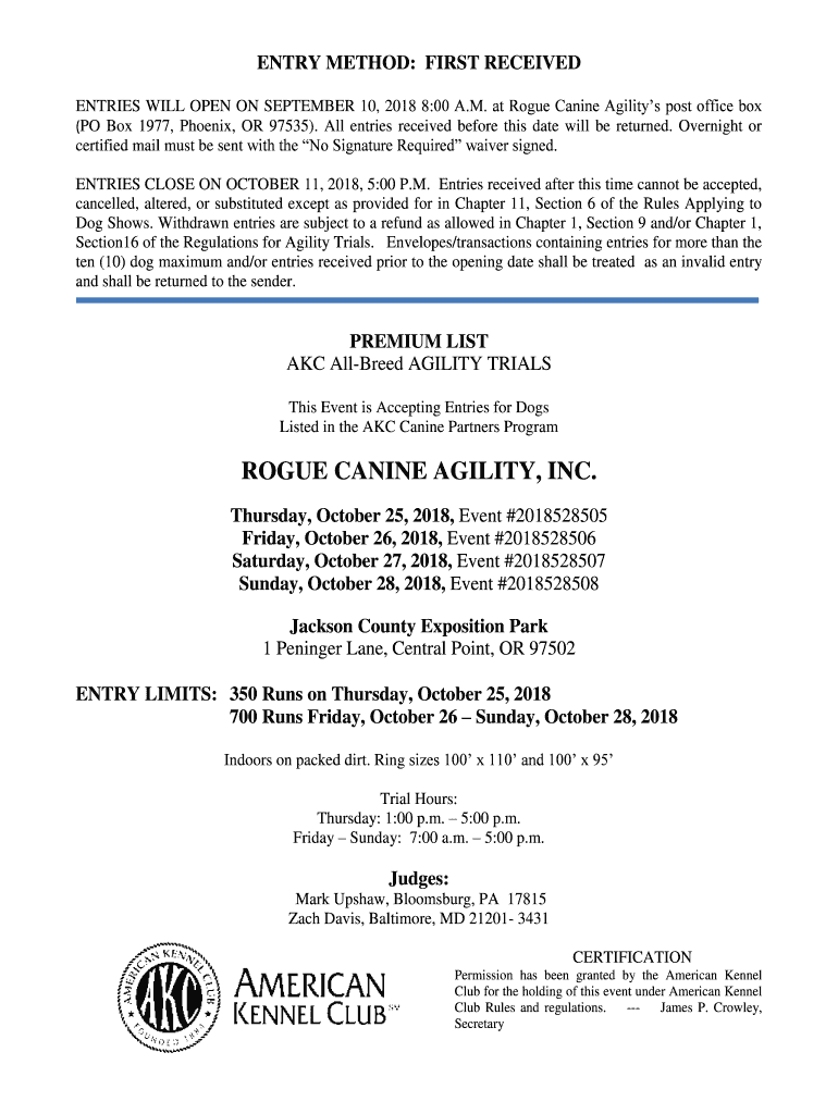 ENTRIES WILL OPEN ON SEPTEMBER 10, 2018 8:00 A.M. at Rogue Canine Agility post office box