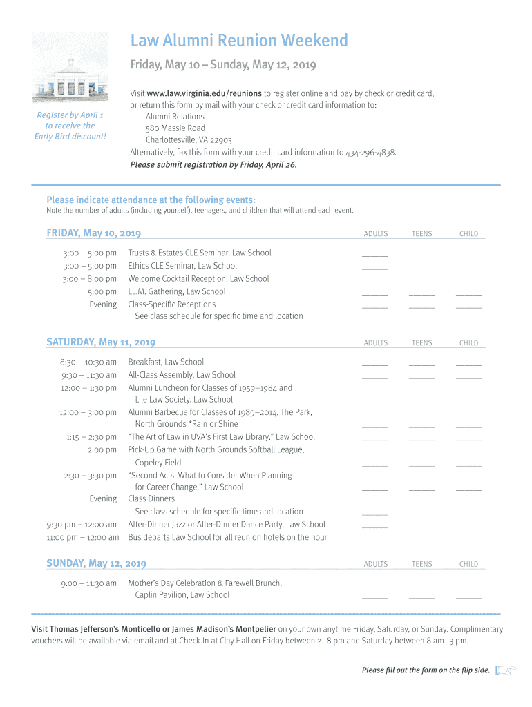 Law Alumni Reunion Weekend Friday, May 10 Sunday, May 12, 2019Register by April 1 to receive the Early Bird discount! Visit www.law.virginia.edu/reunions to register online and pay by check or credit