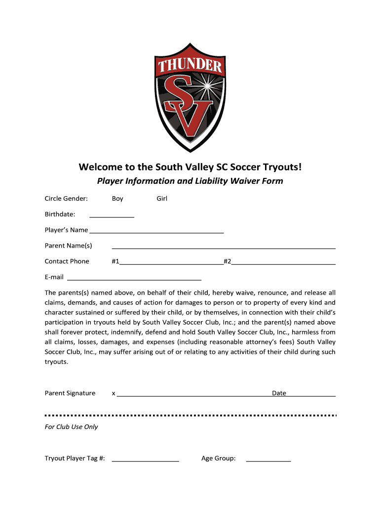 Get the free South Valley SC Soccer Tryout Player Info and Waiver Form