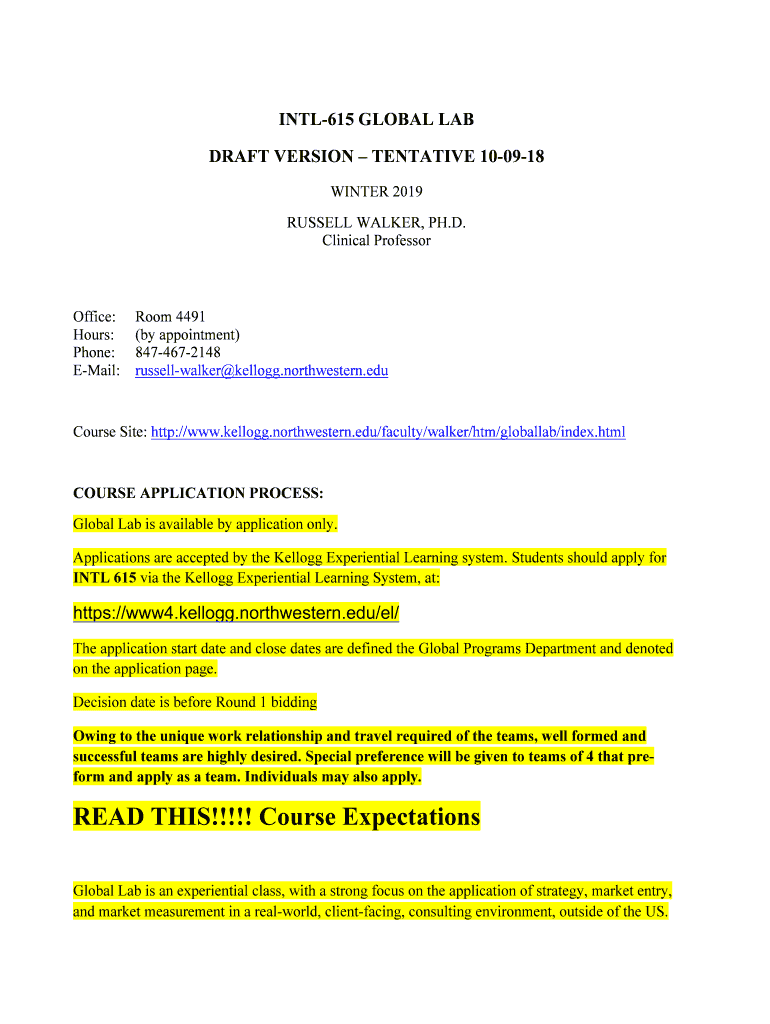 INTL615 GLOBAL LAB DRAFT VERSION TENTATIVE 100918 WINTER 2019 RUSSELL WALKER, Ph.D. Clinical ProfessorOffice: Hours: Phone: Email:Room 4491 (by appointment) 8474672148 russellwalker Kellogg.northwestern.course