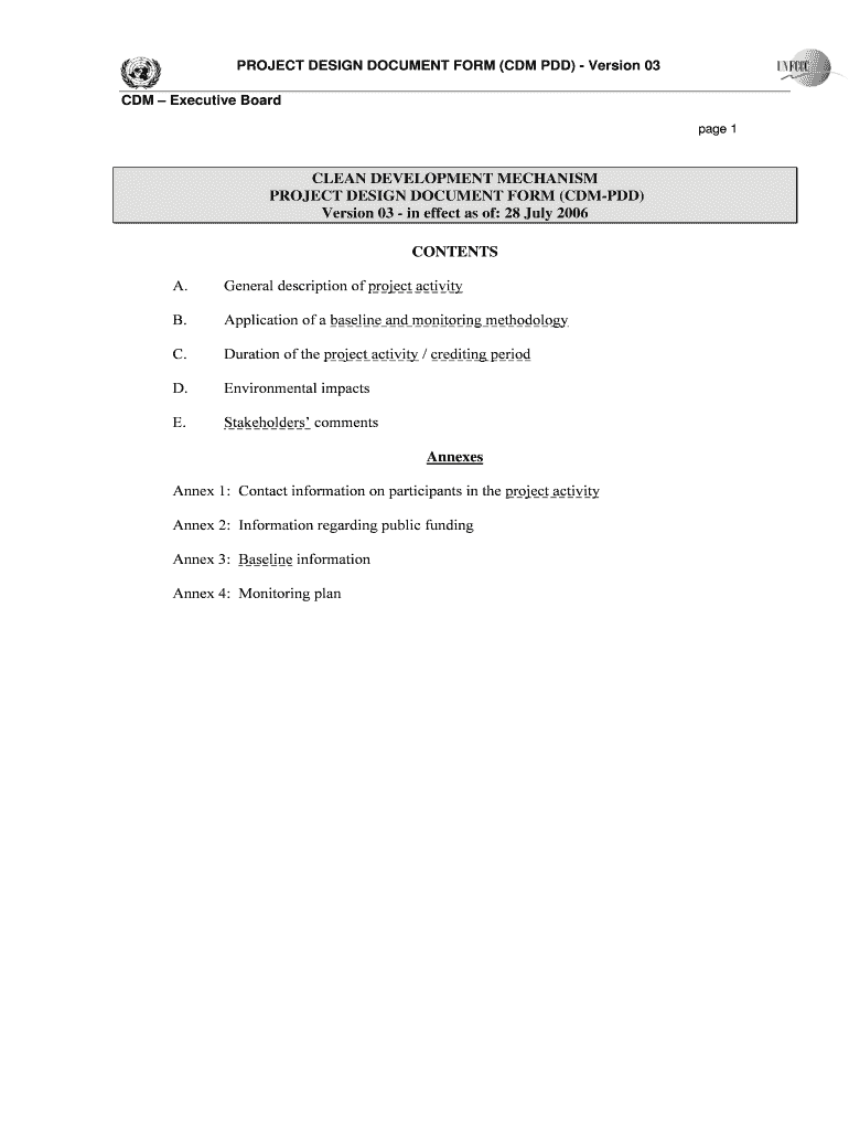 PROJECT DESIGN DOCUMENT FORM (CDM PDD) Version 03 CDM Executive Board page 1CLEAN DEVELOPMENT MECHANISM PROJECT DESIGN DOCUMENT FORM (CDM PDD) Version 03 in effect as of: 28 July 2006 CONTENTS A.