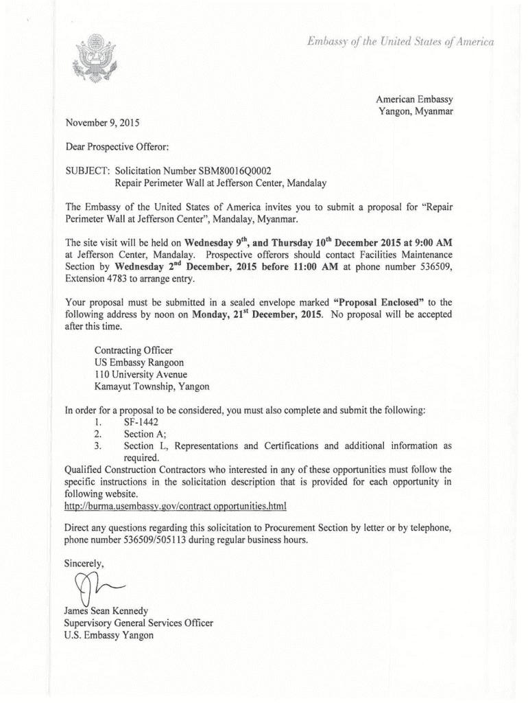 Emma 'SY of the United States of America American Embassy Yangon, Myanmar November 9, 2015, Dear Prospective Offer or: SUBJECT: Solicitation Number SBM80016Q0002 Repair Perimeter Wall at Jefferson