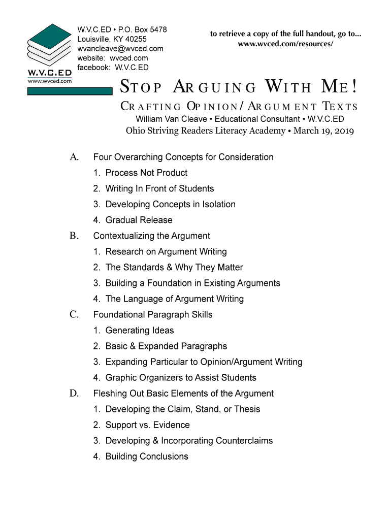 W.V.C.ED P.O. Box 5478 Louisville, KY 40255 wvancleave wvced.com website: wvced.com Facebook: W.V.C.EDTA retrieve a copy of the full handout, go to... www.wvced.com/resources/Stop Arguing With Me!
