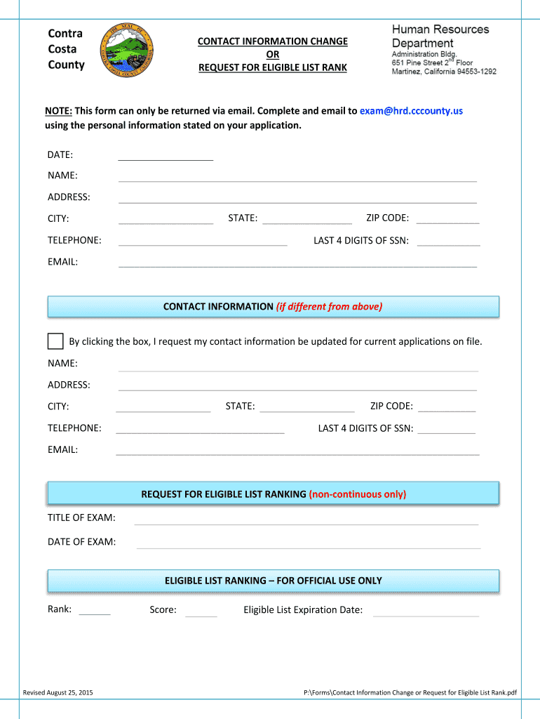 CONTACT INFORMATION CHANGE OR REQUEST FOR ELIGIBLE LIST BANKNOTE: This form can only be returned via email. Complete and email to exam HRD.cc county.us using the personal information stated on your