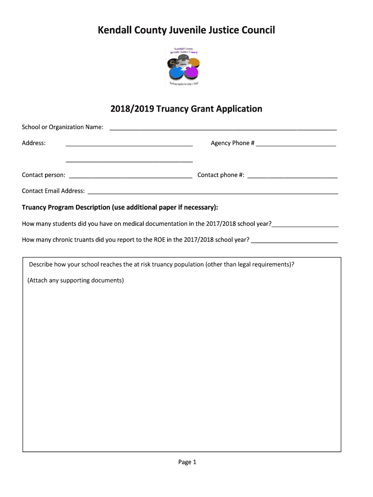 Kendall County Juvenile Justice Council2018/2019 Truancy Grant Application School or Organization Name: Address: Agency Phone # Contact person: Contact phone #: Contact Email Address: Truancy Program