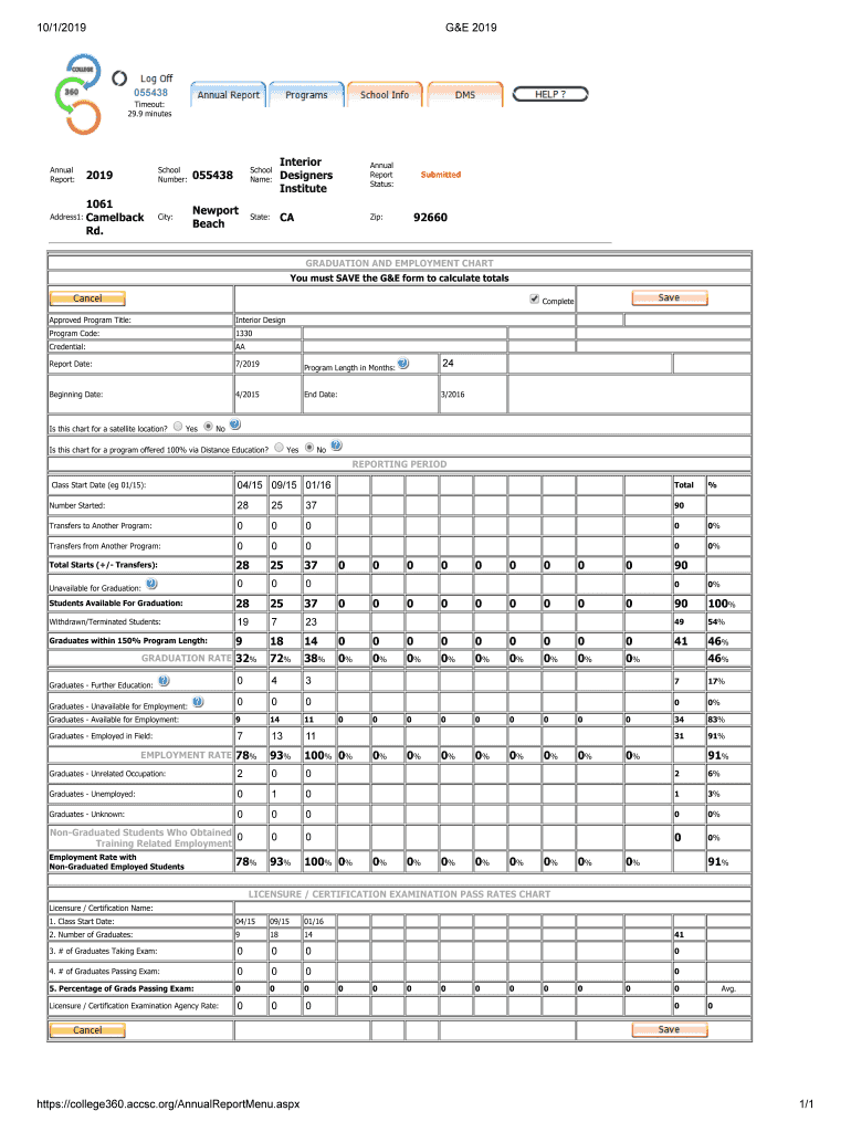 10/1/2019G&E 2019055438 Timeouts: 29.9 minutesAnnual Report:2019School Number:055438School Name:Interior Designers InstituteAnnual Report Status:Address1:1061 Camelback Rd. City:Newport Backstage:Camp:Submitted92660GRADUATION