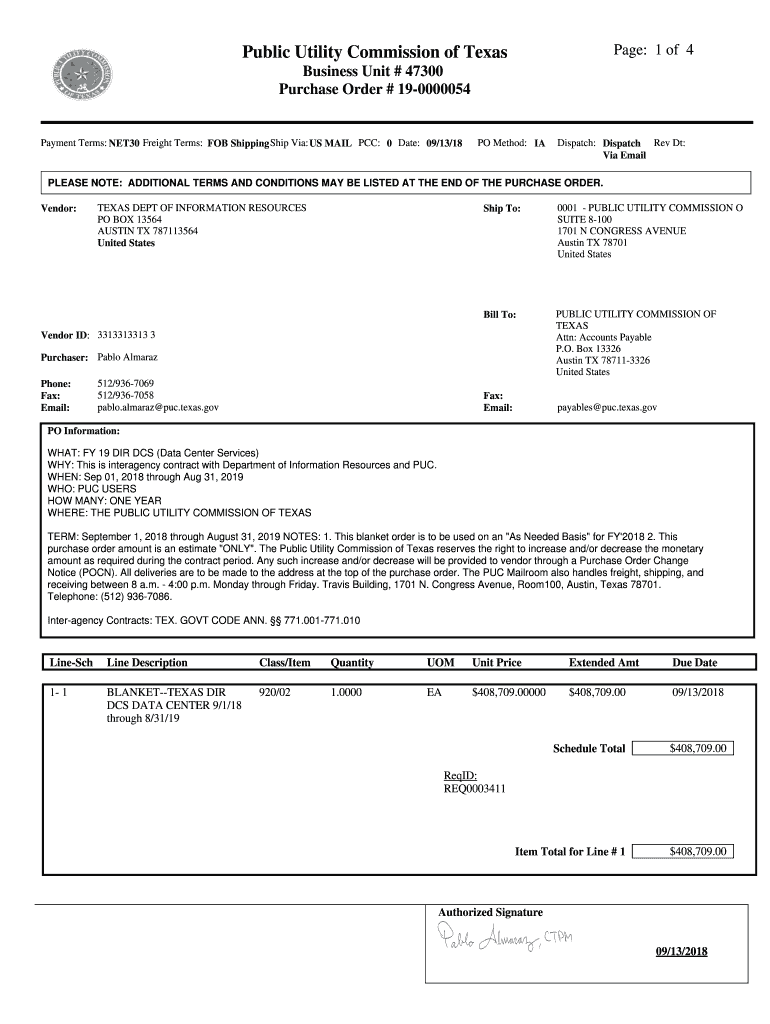 Page: 1 of 4Public Utility Commission of Texas Business Unit # 47300 Purchase Order # 190000054Payment Terms: NET30 Freight Terms: FOB Shipping Ship Via:US MAIL PCC: 0 Date: 09/13/18PO Method: Dispatch: