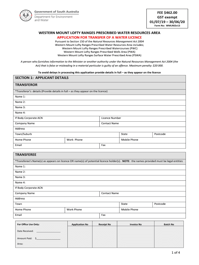 FEE $462.00 GST exempt 01/07/19 30/06/20 Form No: WMLR02v13WESTERN MOUNT LOFTY RANGES PRESCRIBED WATER RESOURCES AREA APPLICATION FOR TRANSFER OF A WATER License Pursuant to Section 150 of the Natural