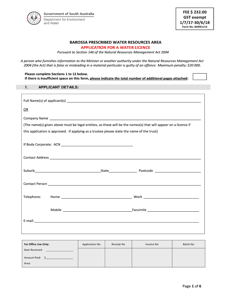 Form No. BAR01v15BAROSSA PRESCRIBED WATER RESOURCES AREA