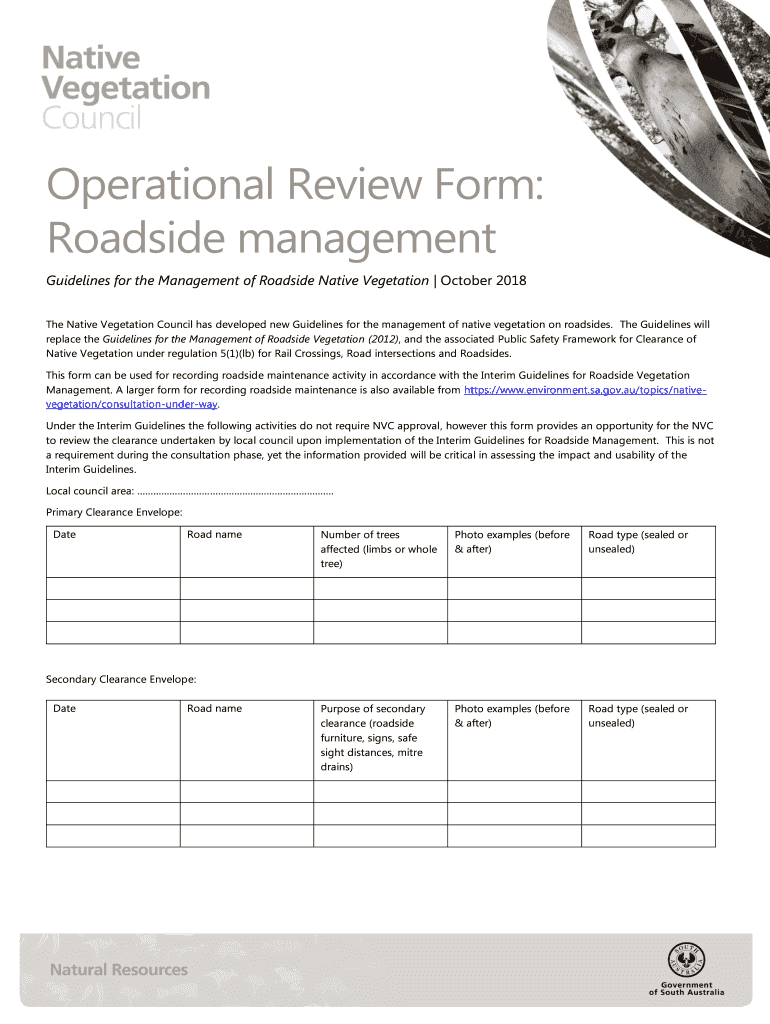 Operational Review Form: Roadside management Guidelines for the Management of Roadside Native Vegetation October 2018 The Native Vegetation Council has developed new Guidelines for the management