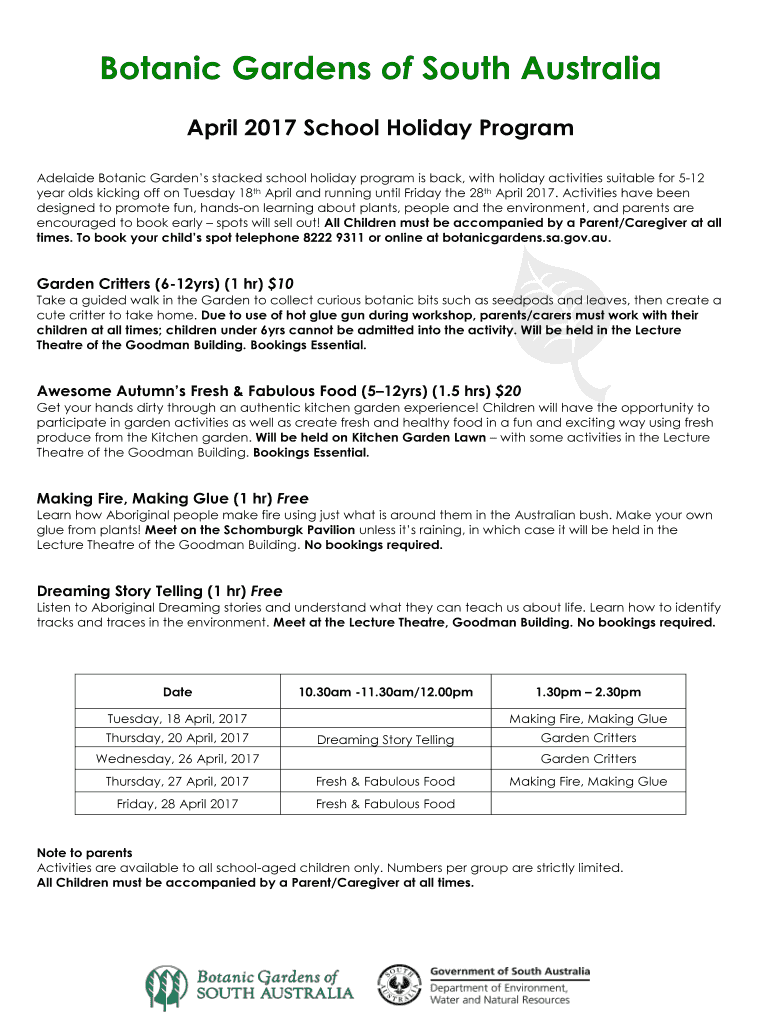 Botanic Gardens of South Australia April 2017 School Holiday Program Adelaide Botanic Gardens stacked school holiday program is back, with holiday activities suitable for 512-year-olds kicking off