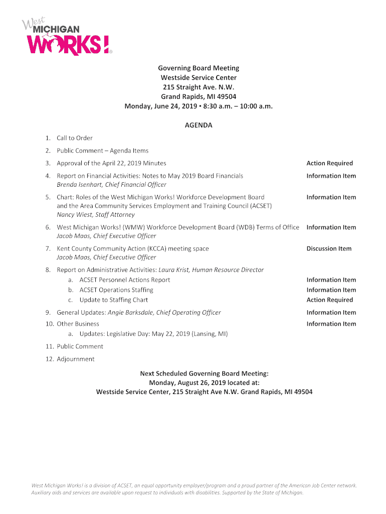 Governing Board Meeting Westside Service Center 215 Straight Ave. N.W. Grand Rapids, MI 49504 Monday, June 24, 2019 8:30 a.m. 10:00 a.m. AGENDA 1. Call to Order 2. Public Comment Agenda Items 3. Approval
