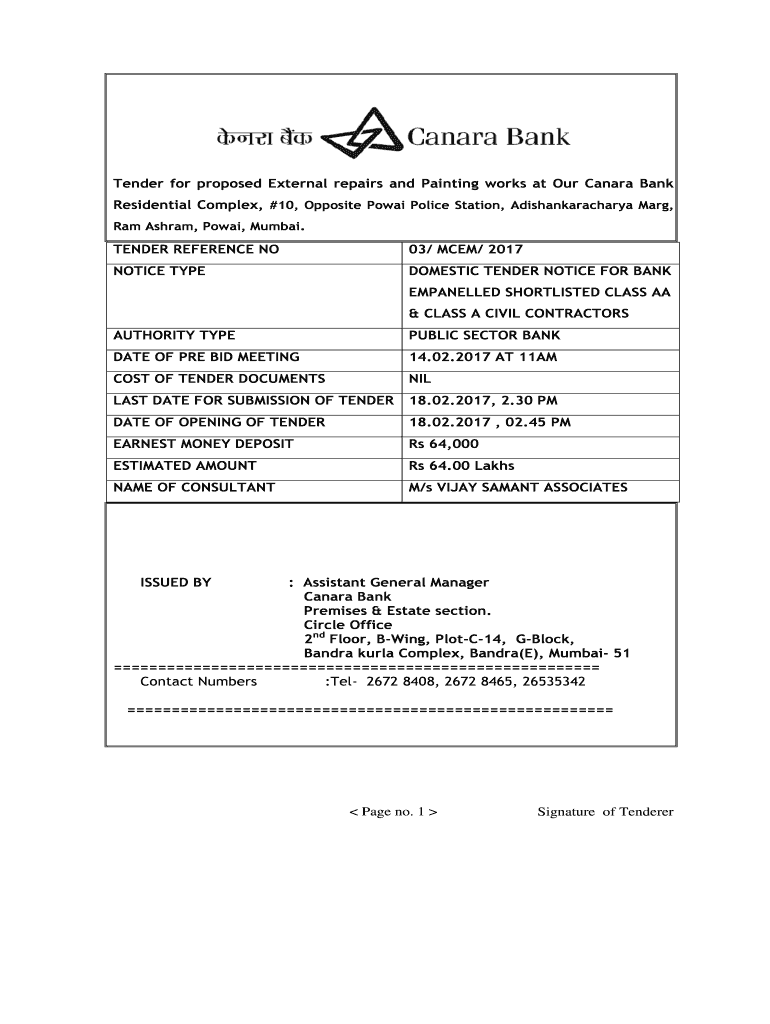 Tender for proposed External repairs and Painting works at Our Canada Bank Residential Complex, #10, Opposite Bowie Police Station, Adishankaracharya Mary, Ram Ashram, Bowie, Mumbai. TENDER REFERENCE