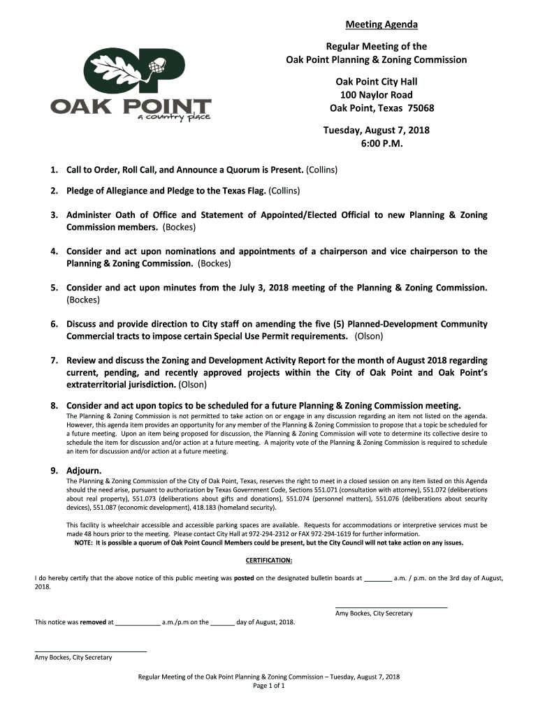 Meeting Agenda Regular Meeting of the Oak Point Planning & Zoning Commission Oak Point City Hall 100 Naylor Road Oak Point, Texas 75068 Tuesday, August 7, 2018 6:00 P.M. 1. Call to Order, Roll Call,