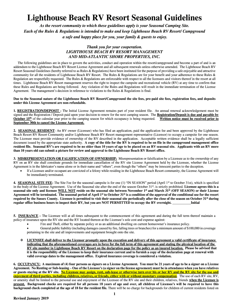 Lighthouse Beach RV Resort Seasonal Guidelines As the resort community to which these guidelines apply is your Seasonal Camping Site. Each of the Rules & Regulations is intended to make and keep Lighthouse