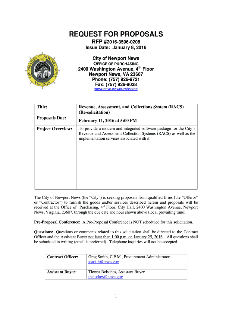 REQUEST FOR PROPOSALS RFP #201635960208 Issue Date: January 8, 2016, City of Newport News OFFICE OF PURCHASING 2400 Washington Avenue, 4th Floor Newport News, VA 23607 Phone: (757) 9268721 Fax: (757)