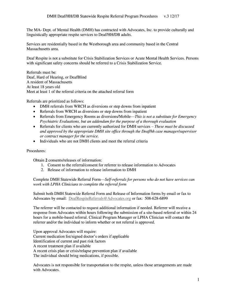 DM Deaf/HH/DB Statewide Respite Referral Program Procedures.3 12/17The MA Dept. of Mental Health (DM) has contracted with Advocates, Inc. to provide culturally and
