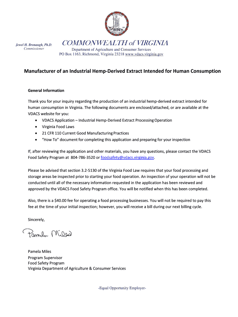 Jewel H. Brought, Ph.D. CommissionerCOMMONWEALTH of VIRGINIA Department of Agriculture and Consumer Services PO Box 1163, Richmond, Virginia 23218 www.vdacs.virginia.govManufacturerofanIndustrialHempDerivedExtractIntendedforHumanConsumption